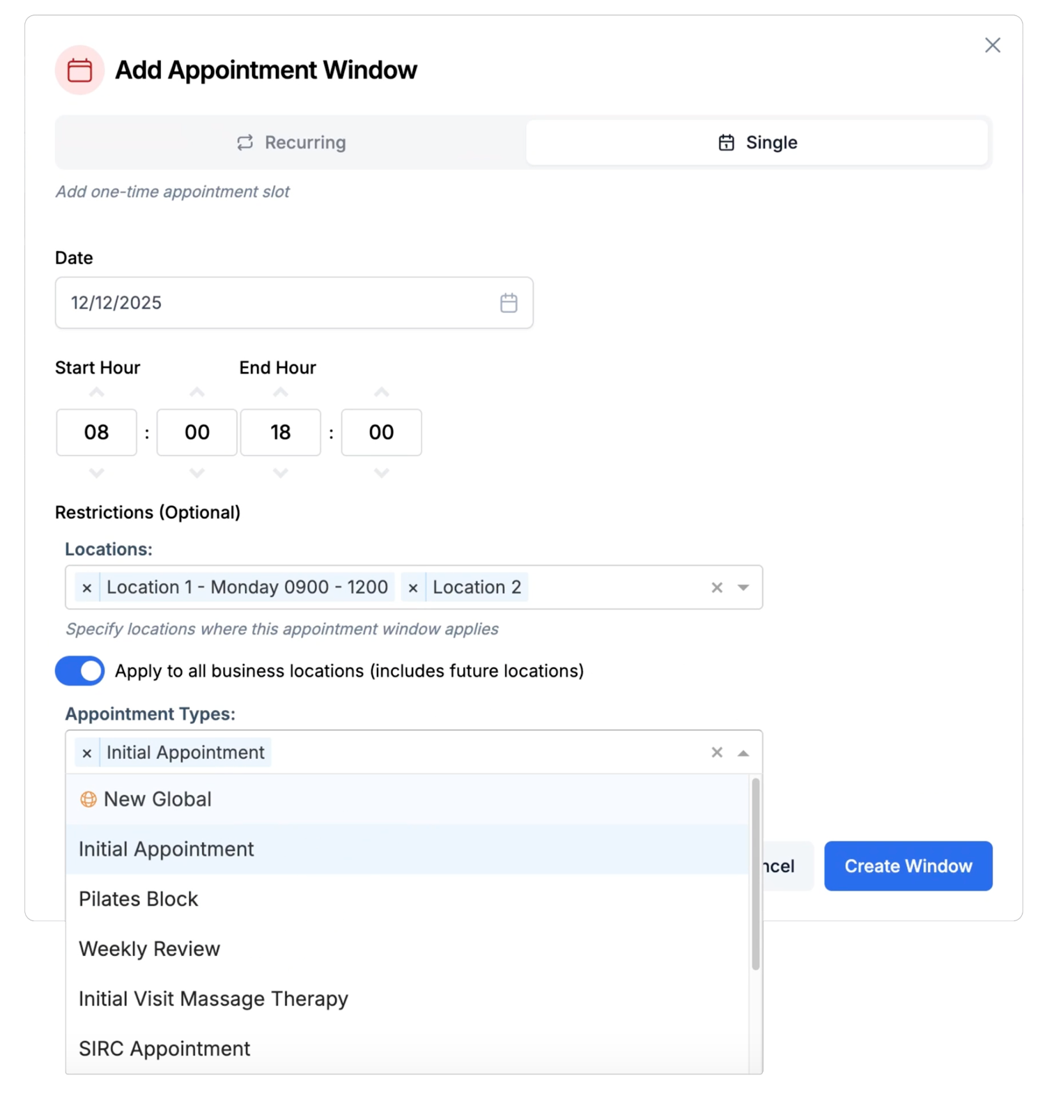 Within these windows you can select which locations are active, choose which appointment types may be booked and tailor availability throughout the day, such as offering initial assessments only in the morning and follow-ups in the afternoon. You can also add individual booking slots when you happen to have a free hour or two.