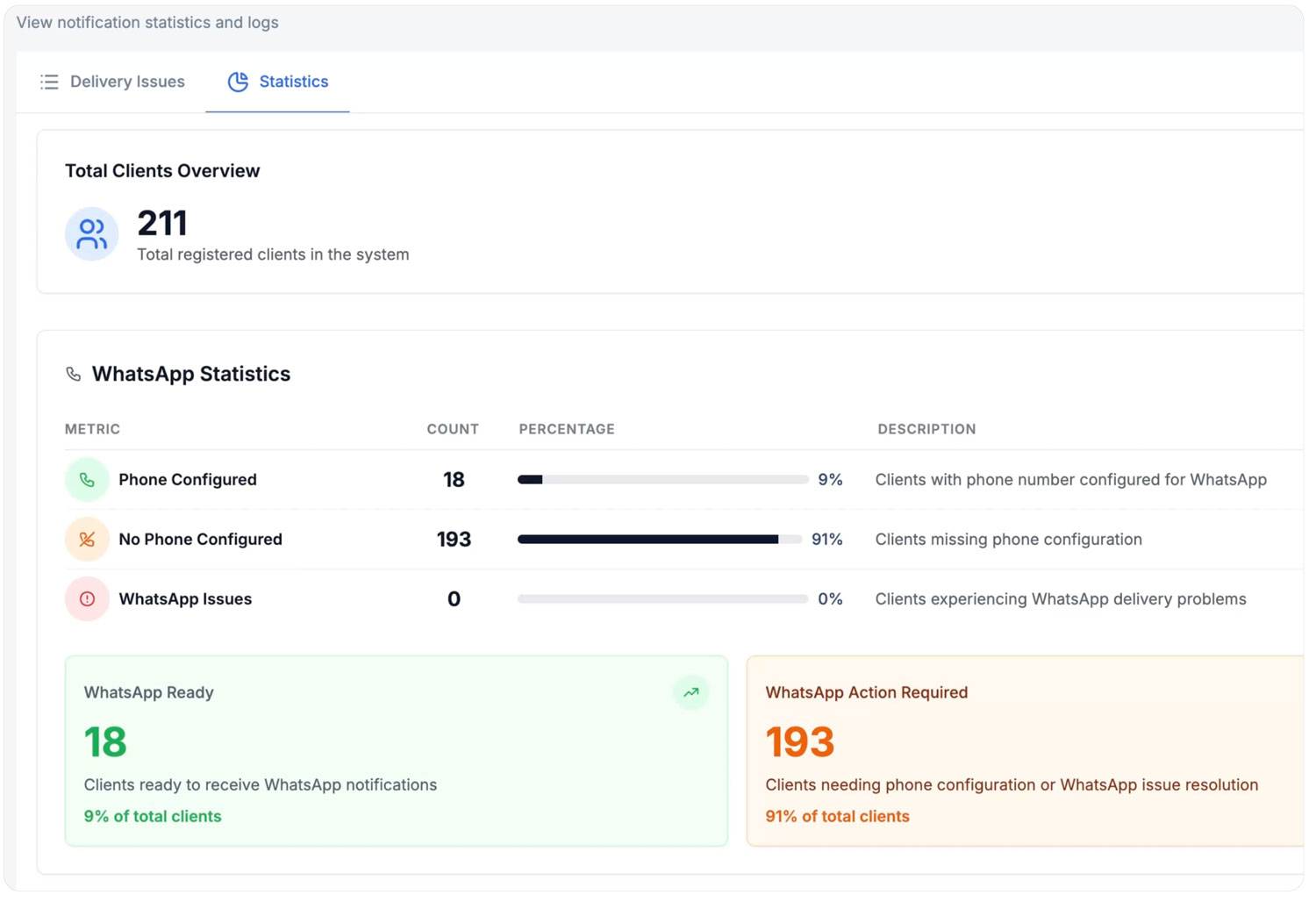 The notifications area now allows you to see whether messages have been delivered, bounced or failed. If a message does not reach your client, you can view clear diagnostic information to understand why. This may include issues with the client’s phone number, problems with their WhatsApp configuration or email deliverability concerns.